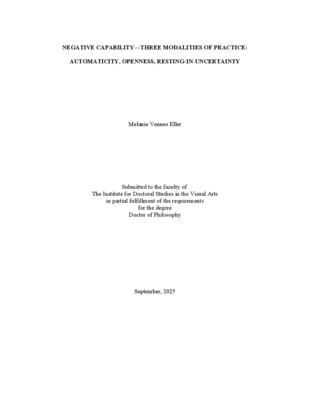 This study investigates the trait of Negative Capability, defined by John Keats as a giving up of one’s capacity to control a situation through grasping after facts and reason, where uncertainty, doubt, and mystery are present. Using art and philosophy, this dissertation argues that investigating the trait of Negative Capability, expressed through modalities of automaticity, openness, and resting-in-uncertainty, provides understanding of how new types of knowledge may emerge during times of doubt, mystery, and uncertainty. Demonstrating Negative Capability is especially important in our current fast-paced global culture in which artificial intelligence and uncertainty are at the forefront, and where stakeholders of knowledge clammer to claim hegemonic objective knowledge for capitalistic gains as well as for the understanding of daily life. This dissertation introduces two new concepts: (part)ticipant and part(o)cularity. A (part)icipant is an observer who, through action, experiences a transformation from observer to (part)icipant. The (part)icipant recognizes they are part of something larger. This recognition occurs through intra-action and inter-action. Part(o)cularity is formed by removing “I,” symbolizing the ego, from “particularity” and making it an o, a circle, symbolizing the enormity in which the Other (part)icipates. The o subsequently changes particularity to part(o)cularity, reminding that our vision is incapable of completely envisioning the Other. Referencing several philosophers in the line of Alfred North Whitehead’s process philosophy, including Henri Bergson and Isabelle Stengers, each modality of Negative Capability presents Whiteheadian vii events during which processes speed up and slow down when rational knowledge leaves the conscious self. The phenomenological philosophy of Jean-Luc Marion, which follows the methodological line of Edmund Husserl and Martin Heidegger, emerges as part of this process.