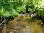 Multiple pipes fitted together lengthwise. Chunks rusting away. Wooden side supports extend into tailwater pool.
