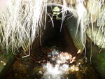 Multiple pipes fitted together lengthwise. Chunks rusting away. Wooden side supports extend into tailwater pool.