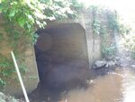 Inlet is open bottom corrugated while outlet is box culvert with open bottom.