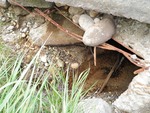 Severe bank erosion watchout cone placed on culvert, appears to be collapsing. Very small flow from pond, less than two feet aid through cattails and stone.