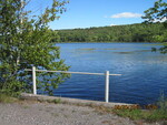 Inlet (East) outlet (West). Causeway to island within Cobbossee Lake.