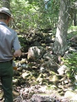 Potentially Impedes AOP. Culvert is rusted through; low level of water; (downstream:fallen tree + rocks =Barrier? (Temporary))