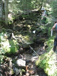 Potentially Impedes AOP. Culvert is rusted through; low level of water; (downstream:fallen tree + rocks =Barrier? (Temporary))