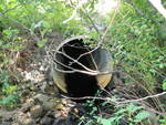 Bottom of outlet rusted out. Water flowing under the outlet.