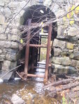 Stone bridge with metal support that blocks. Significant sand build up in scour pool.