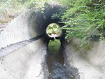 Bottom of culvert is lined with concrete. Weirs in culvert and at outlet, creating step pools. Both ends mitered. Fish upstream.
