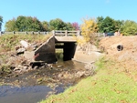 Cement at inlet bottom, wood baffles, natural bottom. Footing inside narrows the width about 2 feet. Water depth in middle of structure is 2.2 feet. Manmade barrier upstream, private land at 404117, 4886887, 1.2' drop see picture 58.
