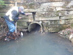 Concrete blocks hae separated from culvert, blocking the inlet. Water flowing under blockage. Inlet measurements taken at separation of culvert.