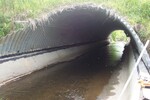 pipe arch with cement bottom; smaller culvert comes into side of this one about 65 feet down, probably from storm drain in road. another northerly about 25 feet away, exits into riprap face of this pipe.