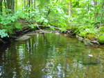 Stone bridge with concrete bottom, not a perfect square- T-shaped. Fish present in holding pools at inlet (young of year). 3m upstream appears to be very shallow, difficult fish passage at low flow.