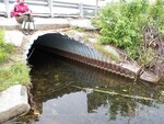 Culvert between wetland and Pleasant Pond; no water velocity through culvert; "inlet" on wetland side, "outlet" on pond side but no flow between two water bodies; bank height above culvert 1.25