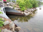 Culvert between wetland and Pleasant Pond; no water velocity through culvert; "inlet" on wetland side, "outlet" on pond side but no flow between two water bodies; bank height above culvert 1.25