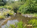 Cobble and sediment built up at primary outlet. Small fish seen within structures. 2 drainage pipes at inlet.