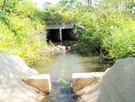 Boulders built up at outlet. Another crossing located right after outlet. Crossing is a large corrugated metal culvert w/concrete lining along the bottom. There is no lining along the first .5m of the inlet, creating a small pool.