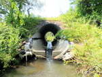 Boulders built up at outlet. Another crossing located right after outlet. Crossing is a large corrugated metal culvert w/concrete lining along the bottom. There is no lining along the first .5m of the inlet, creating a small pool.