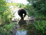 Large corrugated metal culvert w/ concrete lining on the bottom. Lining falls short at inlet and outlet, creating small pools.