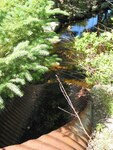 Partially Impedes AOP. Trout. Tar on the bottom to fix the culvert, holes in the culvert, little rock and wood dam upstream (8m), channelized (armoring not high enough when flow more important), downst: rock area, plan, no water at this time