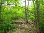 Dry river bed, no water. Looks like newly built house with yard downstream.