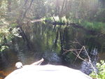 Outlet rusted and broken in places. Two larger culverts added to either end of original slightly smaller culvert.