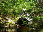 Outlet rusted and broken in places. Two larger culverts added to either end of original slightly smaller culvert.