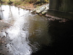 poured rough concrete under bridge; no upstream wetland; bank height above burrow 0.7m; Downstream rock weirs (2) installed in 2012 to back water up through structure