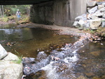 poured rough concrete under bridge; no upstream wetland; bank height above burrow 0.7m; Downstream rock weirs (2) installed in 2012 to back water up through structure
