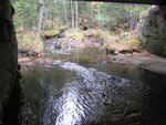 poured rough concrete under bridge; no upstream wetland; bank height above burrow 0.7m; Downstream rock weirs (2) installed in 2012 to back water up through structure