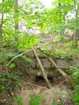 Dry river bed, no water. Looks like newly built house with yard downstream.