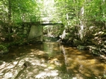 poorly maintaned unpaved road with lots of erosion; Bedrock under most of bridge