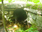 Internal damage, middle partially caved in (<25%) for a meter. 15m downstream wooden foot bridge collapsed into stream (not blocking flow).