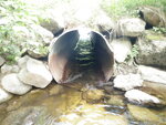 2 culverts joined together lengthwise, drop in the middle (about 0.1 m). 1 is corrugated, the other is not. Stream joins mainstem approx. 15 meters downstream of culvert.