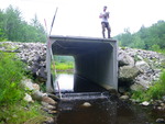 According to local road crew worker there was a recent washout and culvert replaced. The brand new box culvert is not set low enough in stream and water depth is very shallow. Old 1m wide plastic culverts lying in a ditch nearby.