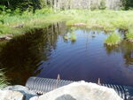 Upstream end of culvert has T-shaped plastic culvert at inlet (see photos). Both ends of the plastic culvert appeared to be capped off, but water was flowing out of the other end. And water could flow around this structure through the primary culvert. Not