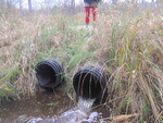 Fill: 0.3m. Blockage of mud/debris midway through primary culvert, blocking flow of water. Possible remains of an old structure upstream. Wetland march area upstream.