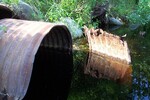 'inlet broken; water in culvert is due to height of pond; swamp at inlet, pond at outlet was unable to determine channel width
