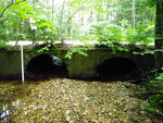 Pipe arches are at an angle, making the bottom not flat. Primary culvert has upward bulge in the middle of the bottom making the middle dry and water run to either side. Outlet bottom is deformed slightly, edge bent upward, not adequate, almost perched.