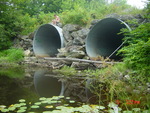 fill: 1m, huge culverts, not perfect circles, fish, Brook too large to measure bankfull, Large remnant dam DS, debris jam
