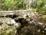 Culvert split in middle at inlet, water going underneath. Rotted at outlet. Appears to have had past blowouts. Secondary culvert is an overflow culvert, perched.