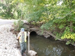 Turns to left on inside of culvert. Banking is armored on one side at outlet, bank erosion opposite. Outlet armored with cement beams, Cement beams at inlet on one side.