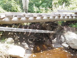 ATV bridge only. Fish upstream. Pond and beaver dam upstream. Large log in stream, which supports bridge and restricts channel. Significantly blocked by beaver dam.