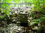 Inlet completely covered by debris, unable to measure. Outlet submerged and setback 0.75m understone armoring with deep scour pool, unable to measure. Water is flowing downstream, but unsure of source since inlet is blocked and water is diverted laterally