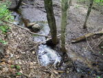 Inlet completely covered by debris, unable to measure. Outlet submerged and setback 0.75m understone armoring with deep scour pool, unable to measure. Water is flowing downstream, but unsure of source since inlet is blocked and water is diverted laterally