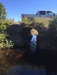 Drainage culvert empties just below outlet. See outlet photo.; Water undercutting culvert at inlet.