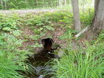 Inlet under a pile of leaves and brush.