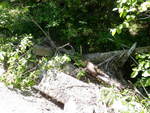 Tree fall or log jam on top of upstream end of culvert. Causing erosion of road. Cement block in stream.