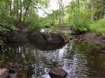 Fish present. Cable holding electric pole upright is anchored in stream near outlet.