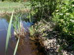 Beaver dam blocking water flowing from wetland into culvert (8928-BeaverDam); beaver fencing blocking 75% of culvert inlet; wetland upstream; bank height above culvert 1.5m