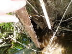 Beaver dam blocking water flowing from wetland into culvert (8928-BeaverDam); beaver fencing blocking 75% of culvert inlet; wetland upstream; bank height above culvert 1.5m
