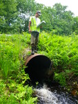 Inlet and outlet deformed and rusted. Stone barrier immediately upstream. Outlet rusted and 0.5m of bottom gone, would be perched is present. Fish present upstream.
